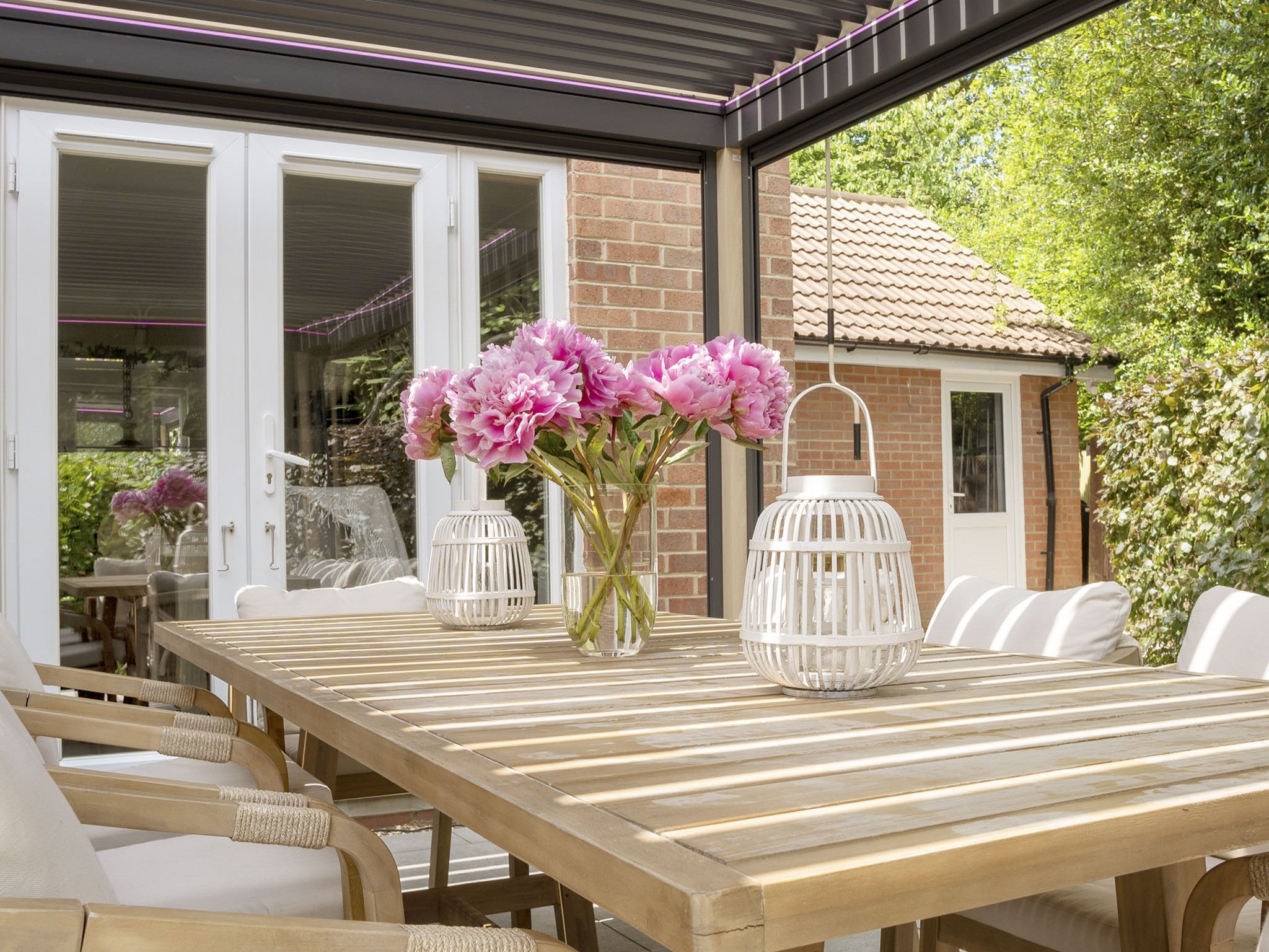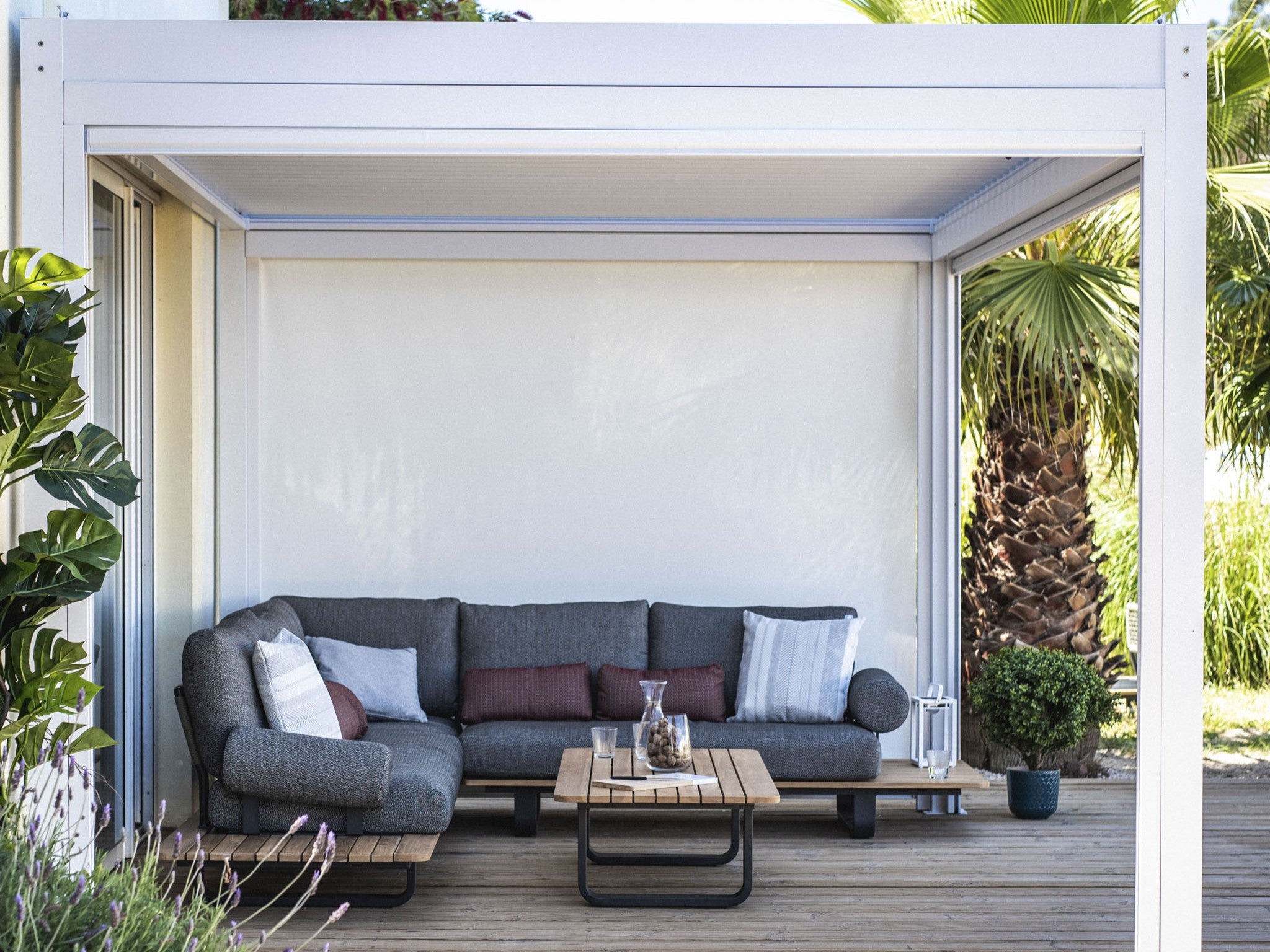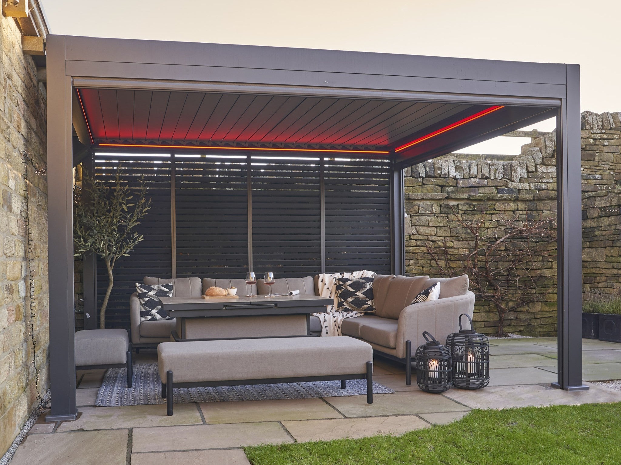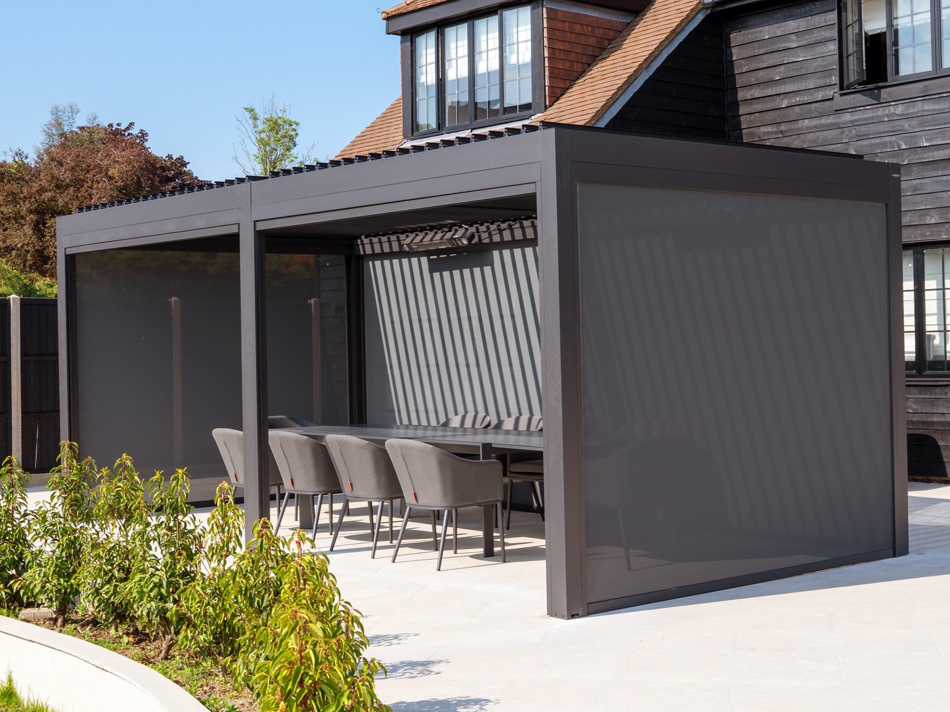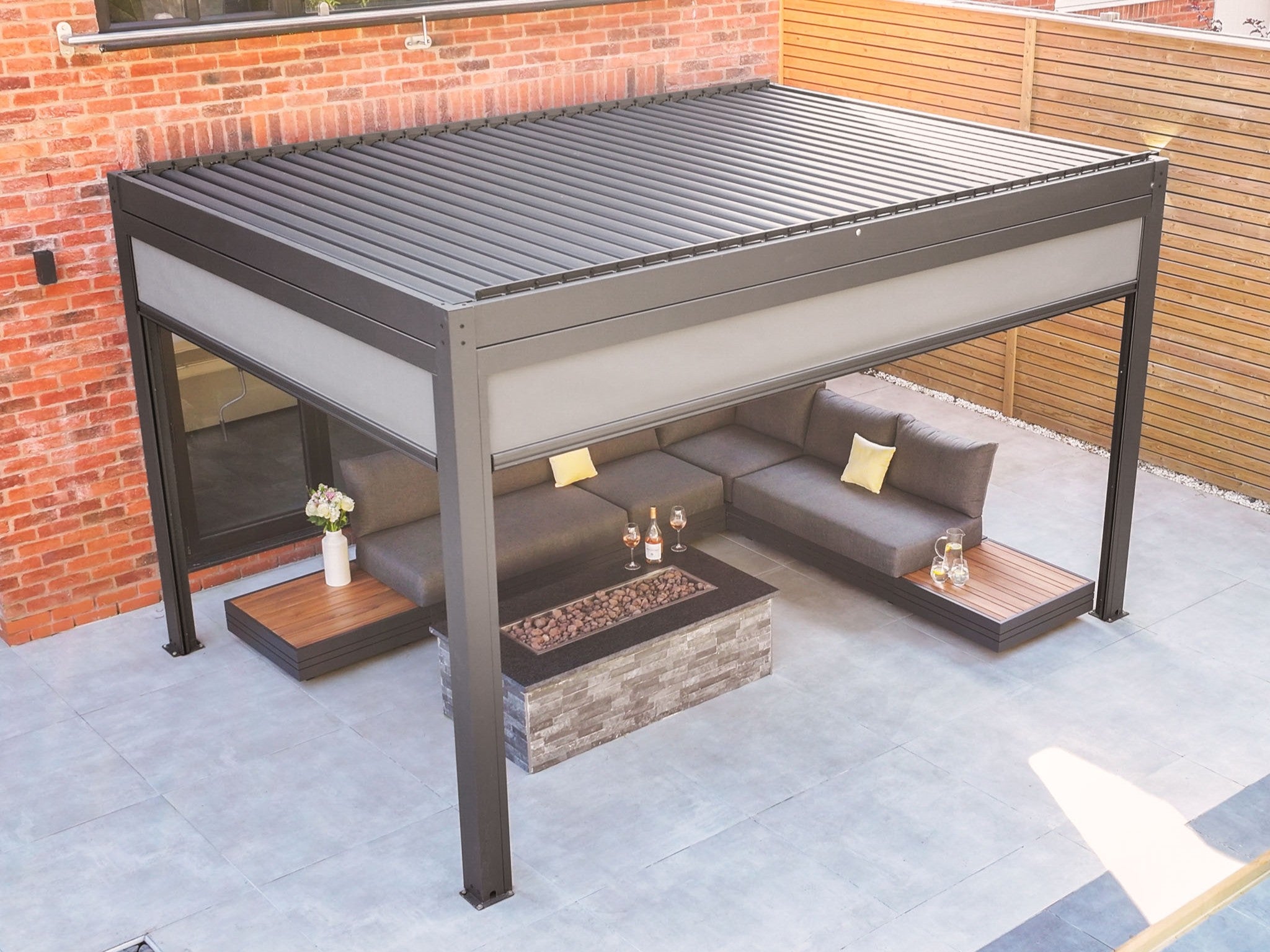 Include covers or canopies: Retractable roofs, drop sides or light curtains provide shade in summer and shelter in drizzle, while making the area feel more private and enclosed.