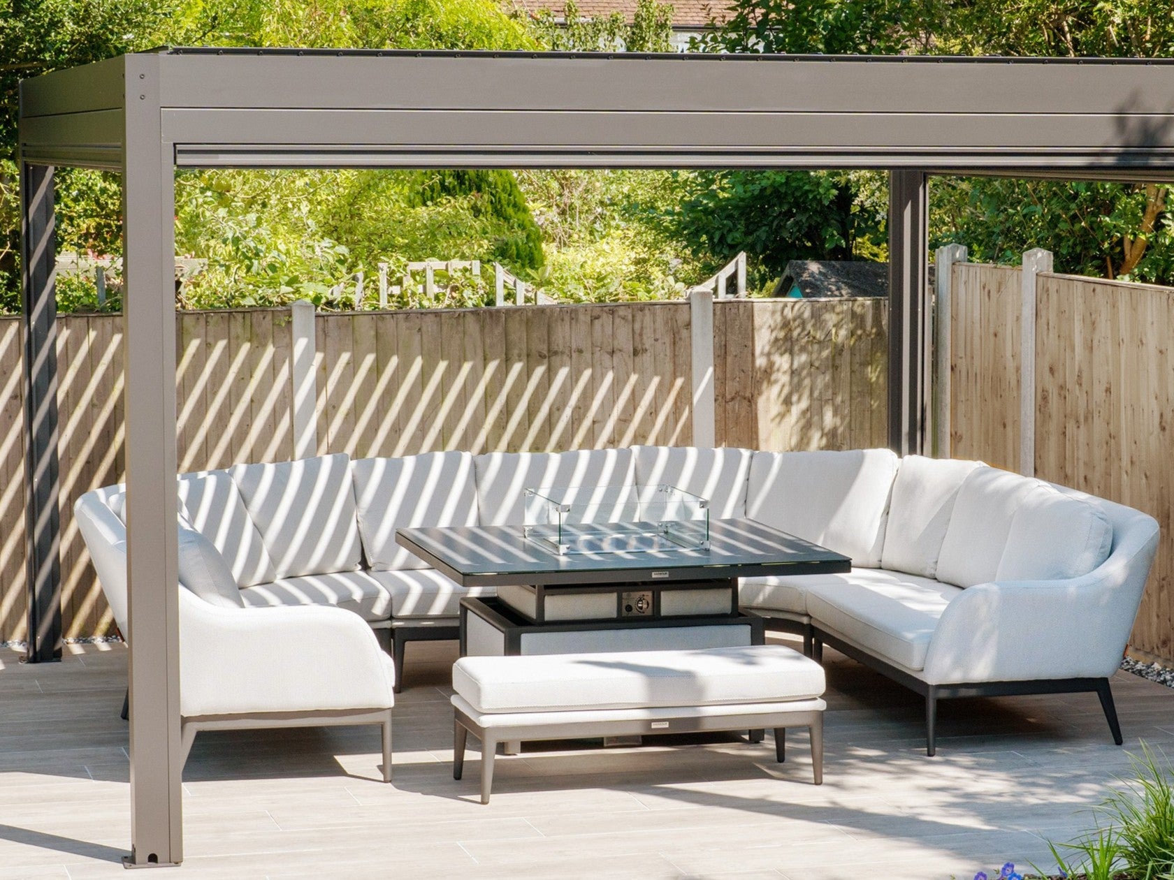 Luna U-Shape Outdoor Fabric Corner Dining with Rising Firepit Table in Oyster Grey – £5,999.00