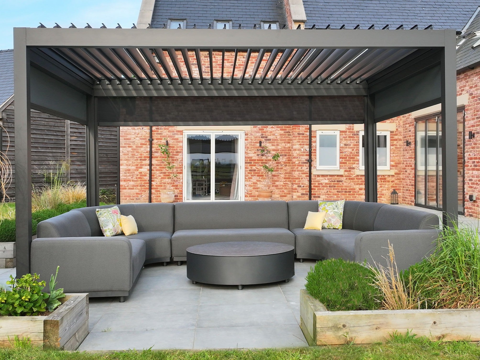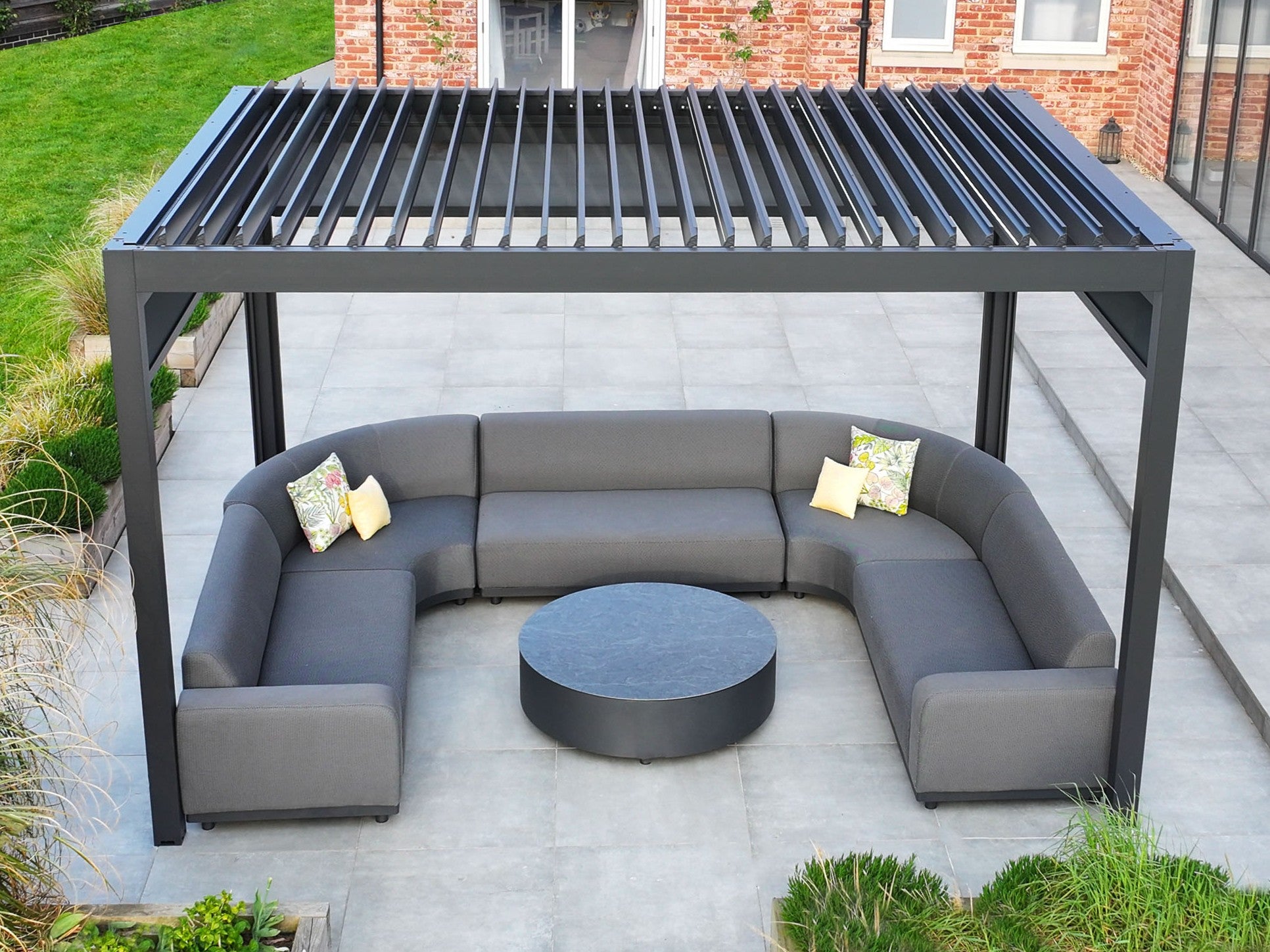 Curves introduce a natural rhythm to outdoor spaces. A circular sofa draws the eye in and makes the area feel more sociable, while leaving the view open to the garden beyond. Pair soft upholstery with a round coffee table or central fire pit to mirror the shape, and anchor the look with a rug that echoes those gentle curves. Soft furnishings are what turn a pergola from a structure into a sanctuary. A woven rug defines the space and adds a touch of warmth, while planters filled with rosemary, jasmine or feathery grass blur the edges between garden and seating zone. Layering textures like fabric, wood and greenery makes the whole area feel settled and inviting, even before you sit down.