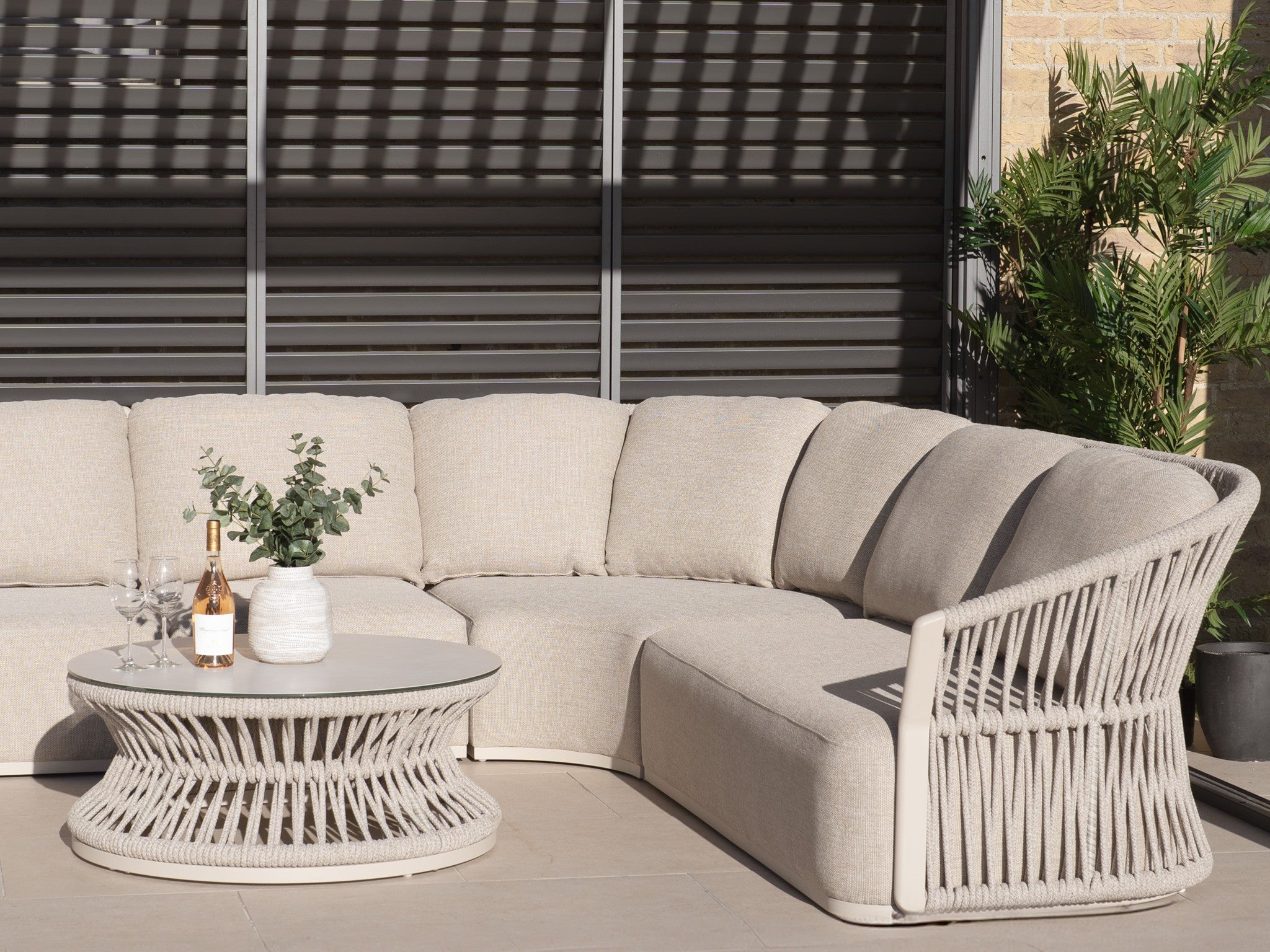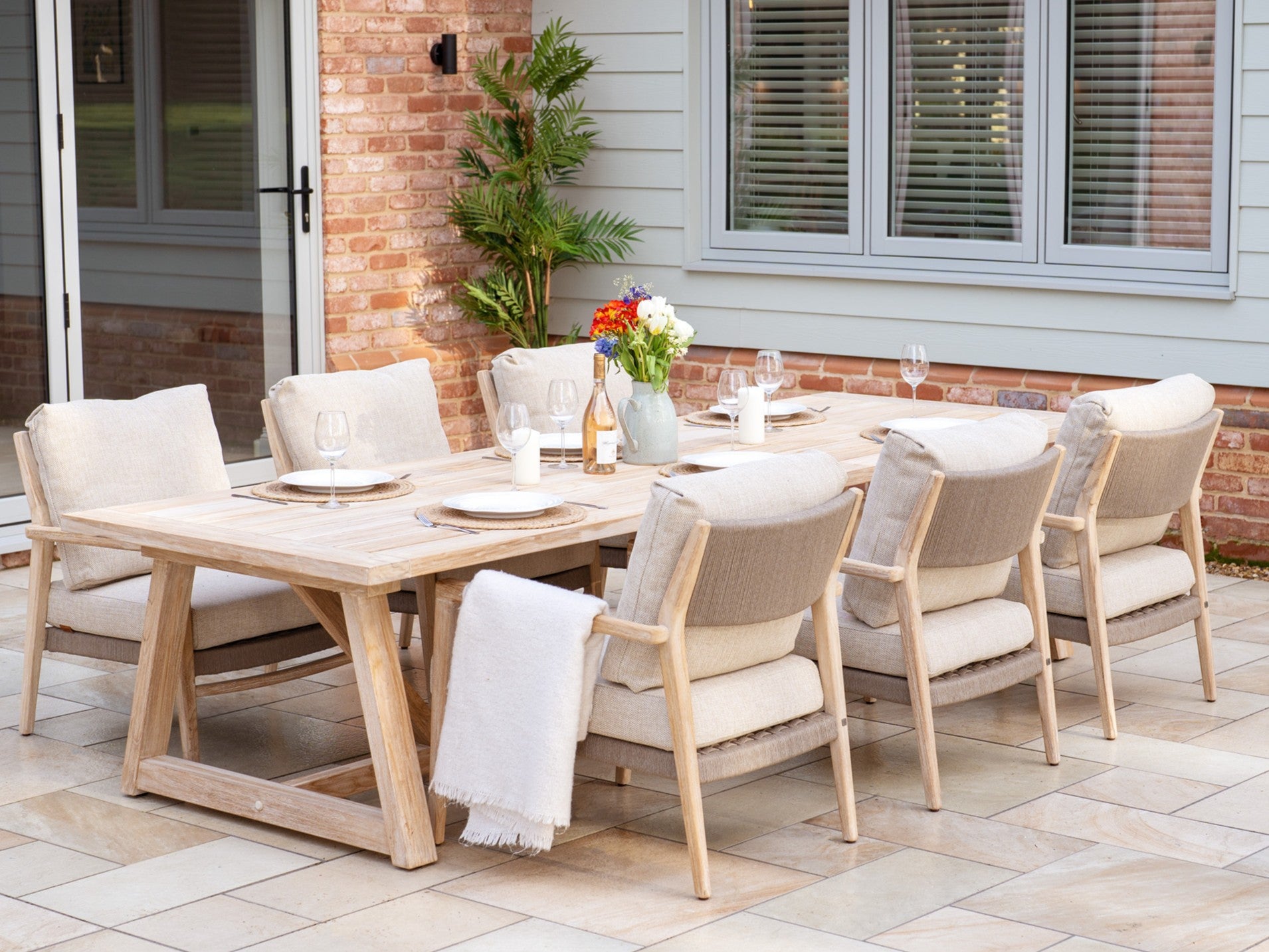 Think of your lounge set as the heart of slow afternoons and unhurried evenings. It’s the perfect spot to invite a friend round for coffee and cake or to share an easy afternoon tea in the open air. Opt for lounge pieces that channel the coastal, Nancy Meyers aesthetic with soft linens, natural weaves and sun-washed tones. Layering these textures creates a space that feels breezy, lived-in and quietly luxurious, made for long chats and slow afternoons.