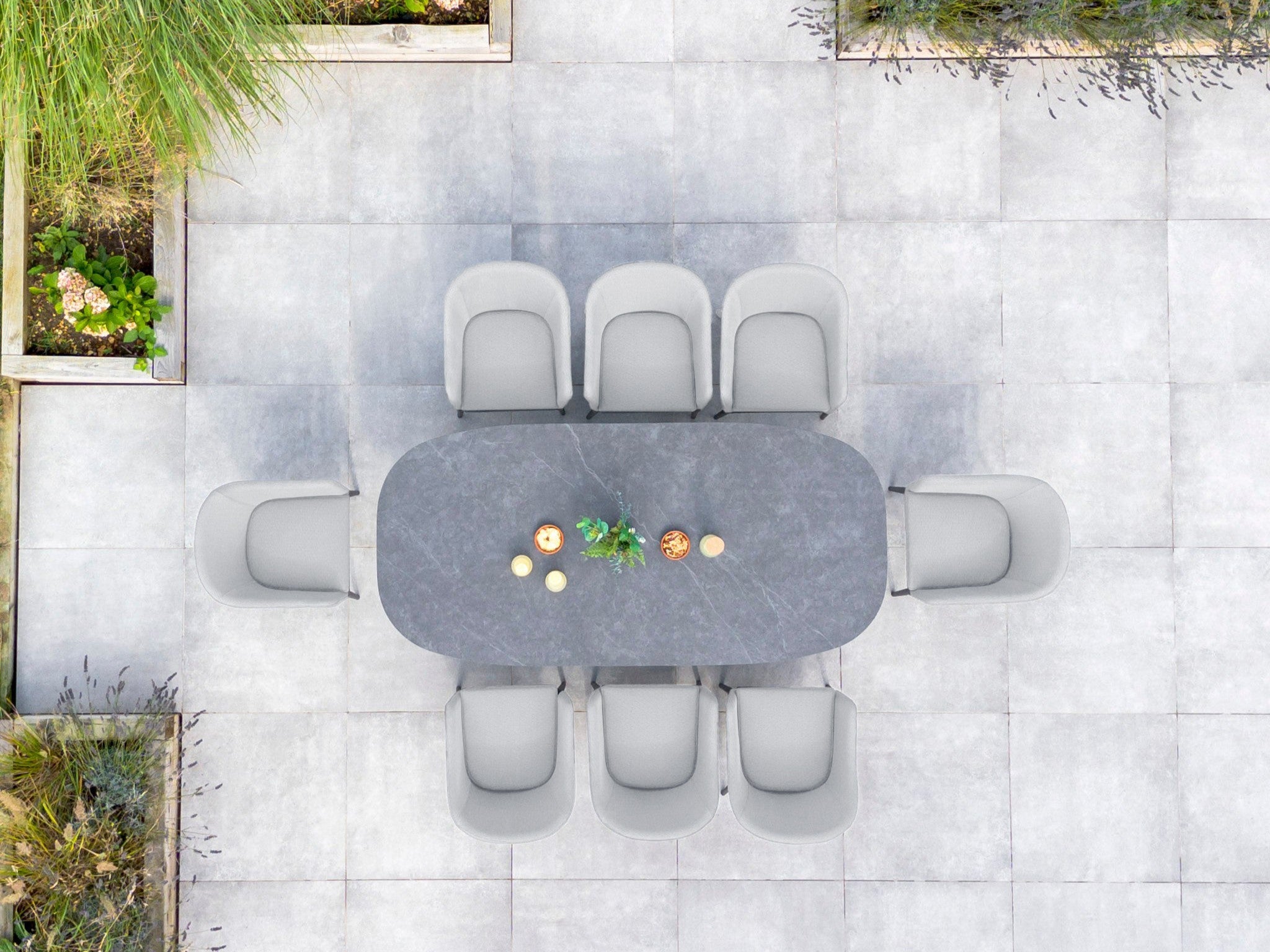 Plan around how you’ll use the space. Dining sets work best centrally, while corner sofas or curved layouts encourage lounging. Leave enough room to move comfortably and align furniture with lighting or focal points like a fire pit or garden view.