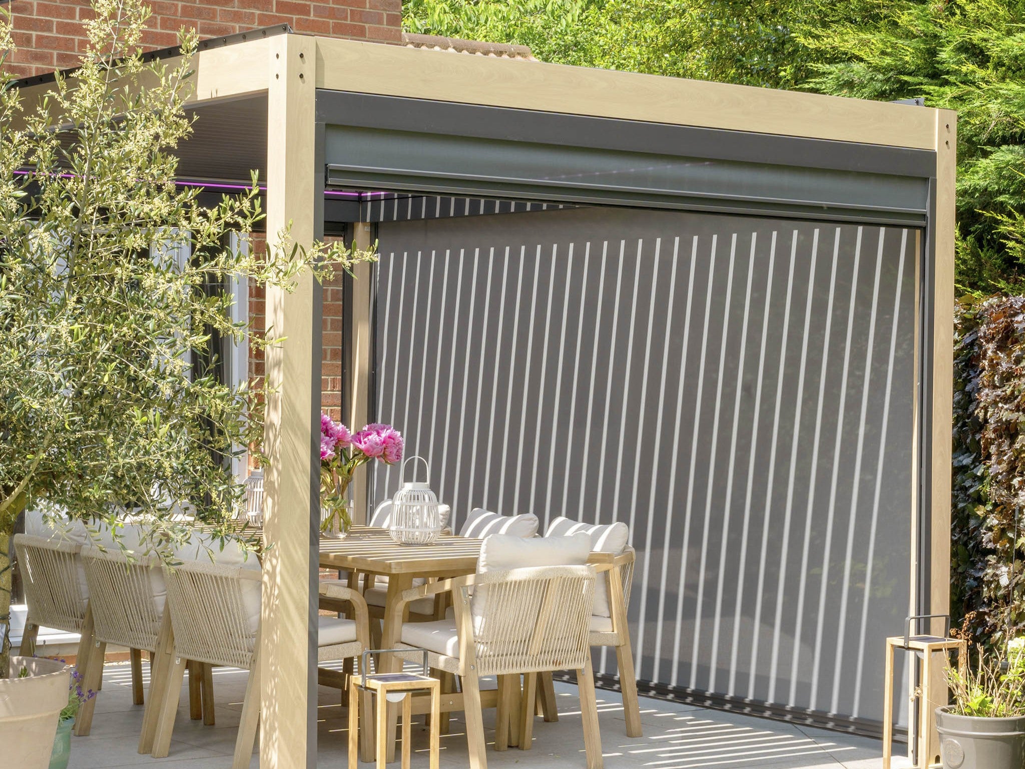 PergoSTET Plus 3m x 4m Rectangular Pergola with 3 Manual Side Blinds and LED Lighting in Latte – £3,999.00