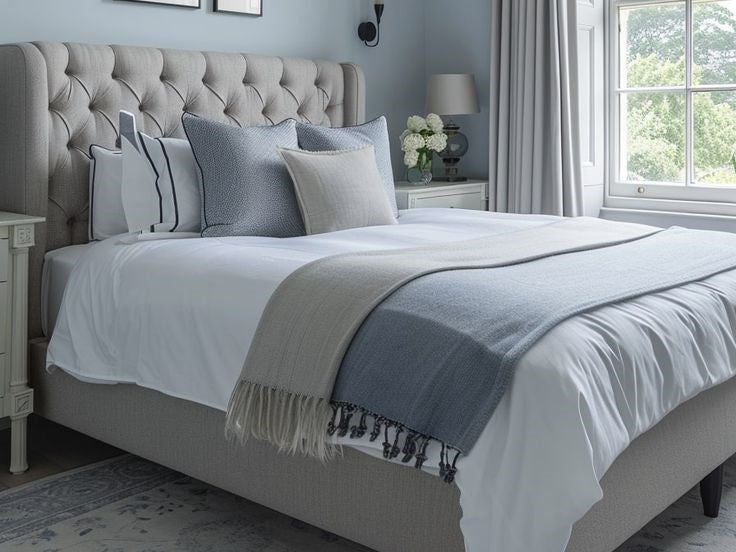 Grey walls are incredibly versatile and pair well with various bedding colours. Opt for neutral tones like white, beige or soft grey for a calm, cohesive look. Introduce richer hues like mustard, navy, or blush pink to add warmth and personality.