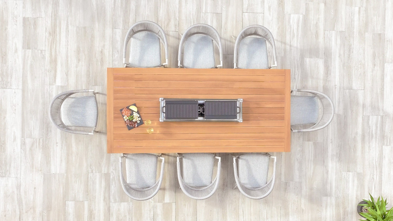 Cloverly 8 Seat Rectangular Teak Firepit Dining Set in Latte – £3,399