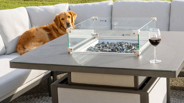 Luna Deluxe Outdoor Fabric Square Corner Dining Set with Rising Firepit Table in Oyster Grey – £4,349