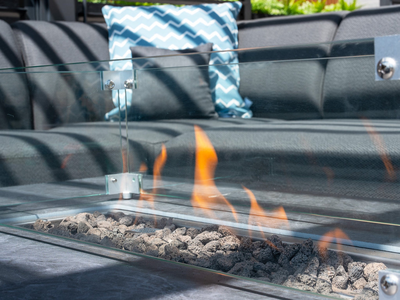 The Ceramic Fire Pit Coffee Table features an aluminium frame finished with TIGER Drylac powder coating and topped with a sophisticated ceramic glass surface. Bringing warmth and style in equal measure, this gas-powered heater includes a fire pit, glass surround, lava rocks and a control panel, making it easy to operate.